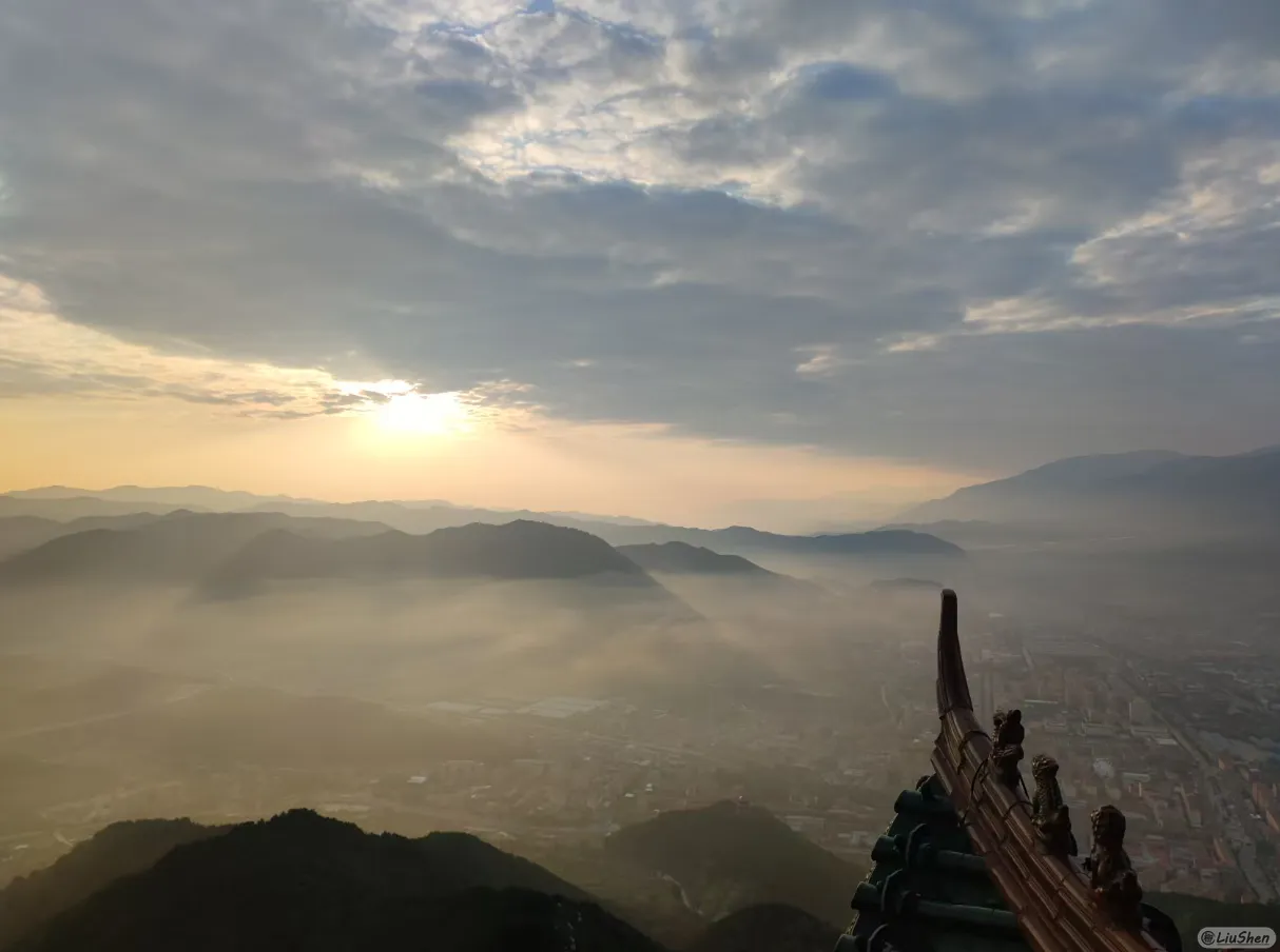 峪口的风掠过山脊,天边晚霞如泼墨般晕染,丁达尔效应让光线化作缕缕金纱,穿透暮霭垂落在苍茫群峰之间。每一束光都像被山神梳理过的琴弦,正弹奏着秦岭最古老的晨昏序曲。